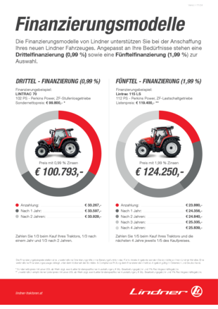 Die Finanzierungsmodelle von Lindner unterstützen Sie bei der Anschaffung Ihres neuen Lindner Fahrzeuges. Angepasst an Ihre Bedürfnisse stehen eine Drittelfinanzierung (0,99 %) sowie eine Fünftelfinanzierung (1,99 %) zur Auswahl.