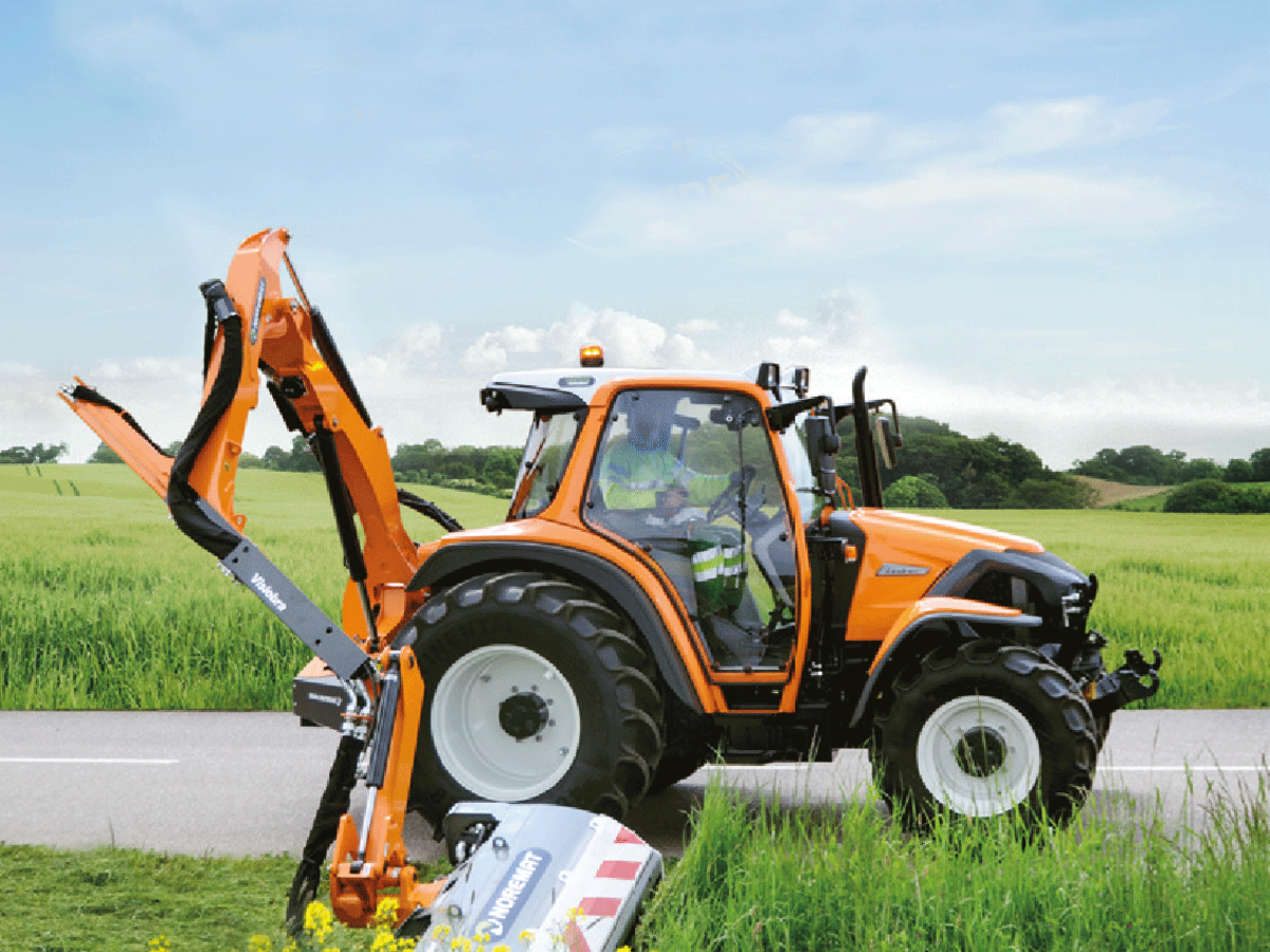 Dafür haben Lindner und das französische Unternehmen Noremat eine eigene Fahrerkabine konstruiert. Der Böschungsmäher mit Knickarm arbeitet seitlich des Fahrers. Er hat so gute Sicht auf das Anbaugerät.Auf der rechten Seite ist eine Polycarbonatscheibe eingebaut. Kracht ein Stein gegen die Windschutzscheibe, wird der Fahrer geschützt. Der Fahrer steuert die Geräte über eine eigene Armlehne mit gleitender Armauflage im Traktor. Dadurch ist ermüdungsfreies Arbeiten über viele Stunden möglich. Erhältlich sind zusätzlich u.a. Profi-Anbaugeräte wie Astschneider, Mulcher oder Leitschienen-Mähgeräte.