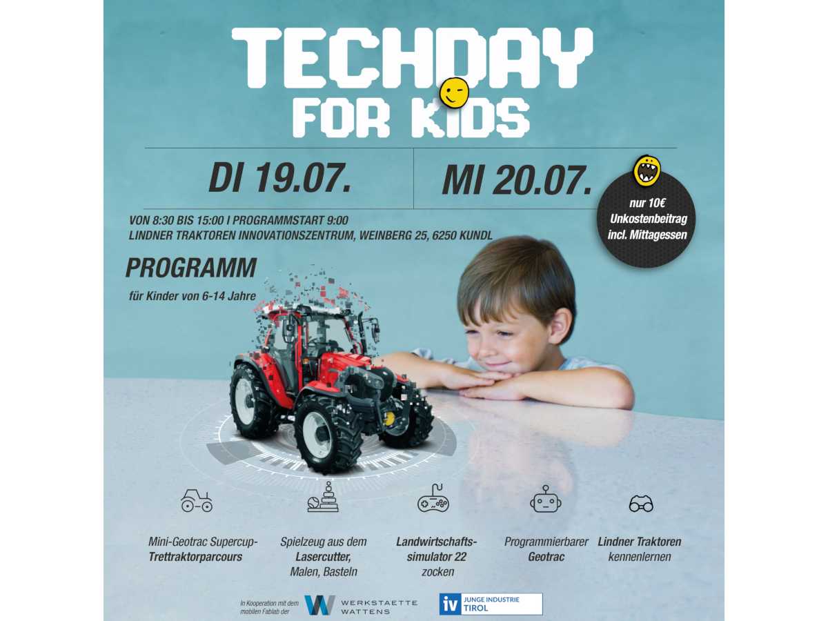 Es ist wieder soweit! Nach zweijähriger Pause freuen wir uns wieder auf die „TechDays for Kids“ im Innovationszentrum. Am 19. und 20. Juli gestalten wir für technikbegeisterte Kinder von 6 bis 14 Jahren einen ganzen Tag voll Spiel, Spaß und Technik. Diesmal können die jungen Techniktalente sogar erste Programmierschritte erlernen und einem ferngesteuerten Traktor das autonome Fahren beibringen.