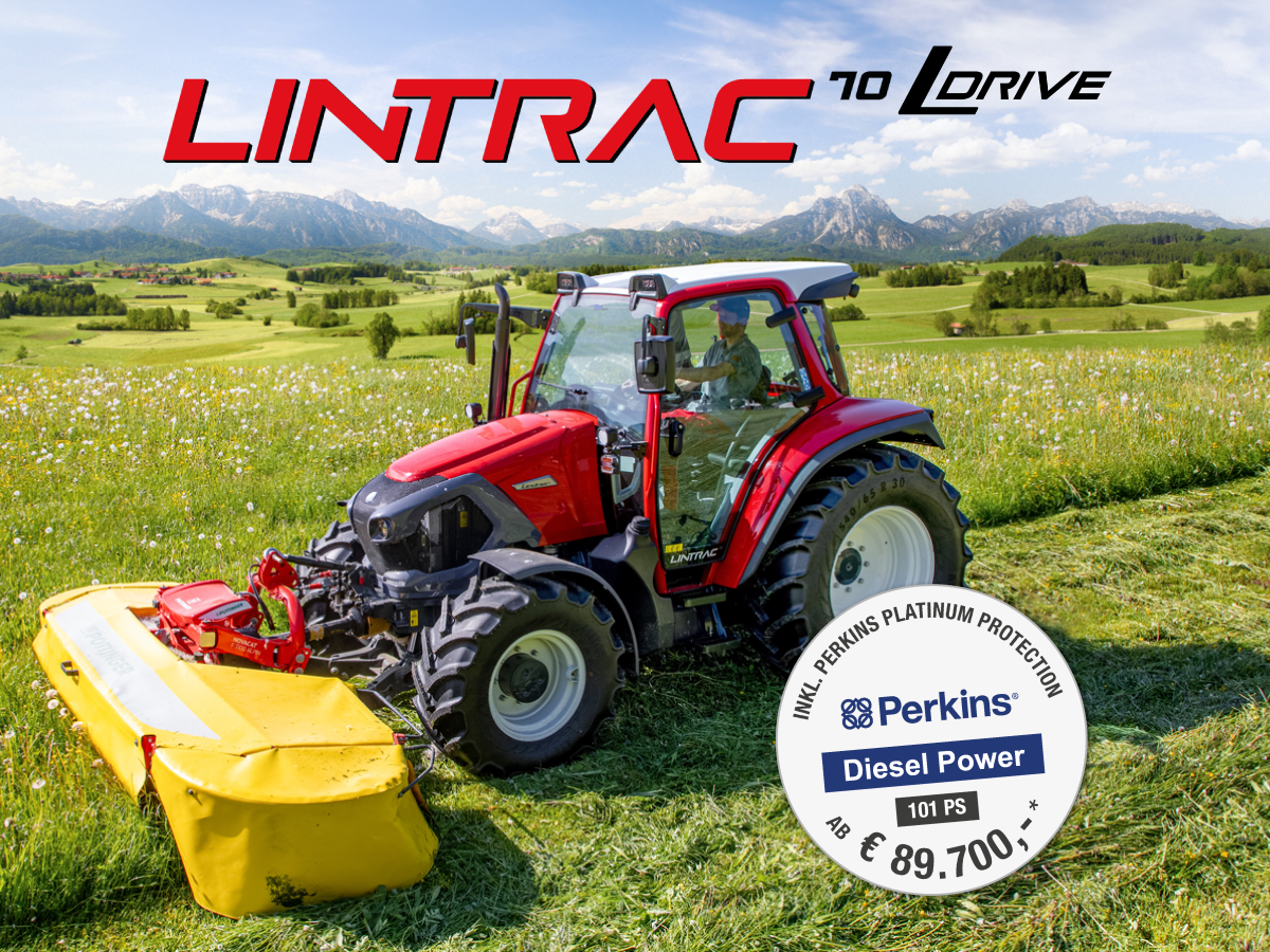 Ein weiterer Fixpunkt im Innovationszentrum ist der stufenlose Lintrac 70 LDrive, der ab € 89.700,- (inkl. USt) als Perkins Power Modell erhältlich ist. Mit der Perkins Platinum Protection (PPP) kann man sich vier Jahre vor unerwarteten Reparaturkosten schützen – das gilt für Motorkomponenten (z. B. Turbolader) und drehende Elektrobauteile (z. B. Starter, Lichtmaschine). Wird der leicht zu bedienende Einsteigertraktor vor Ablauf der PPP verkauft, kann sie problemlos auf den neuen Besitzer übertragen werden.
