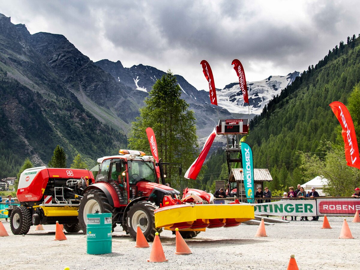 In Sulden in Südtirol manövrierten 25 Teilnehmer einen Geotrac 94ep von Lindner über die Rampe für Schräglagen, die Wippe und durch die Doppelschikane. Besonderes Geschick auf dem engen Parcours erforderte das Rückwärtsfahren mit der Pöttinger-Ballenpresse.